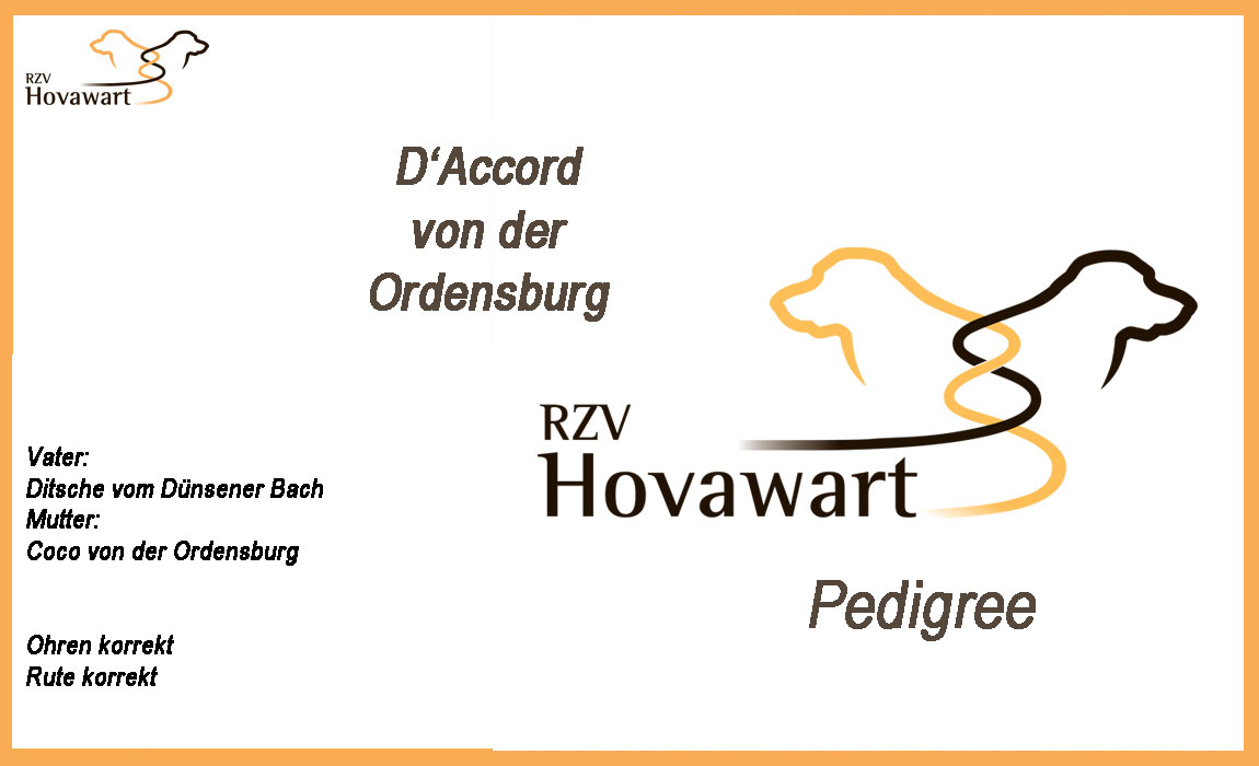 D’ACCORD ist unser vierter Hovawat-Rüde in Folge; außerdem sind wir dreifache Wiederholungstäter mit dem nun dritten Hovawart „von der Ordensburg“ – zuerst Trick, dann Aslan und jetzt D’ACCORD.