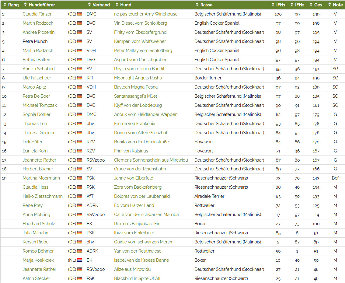 | Wertnoten: *=beste Einzelprüfung | v=vorzüglich | sg=sehr gut | g=gut | bf=befriedigend | mh=mangelhaft | Abbr.=Abbruch | Disq=Disqualifikation | zg=zurückgezogen | ||||||