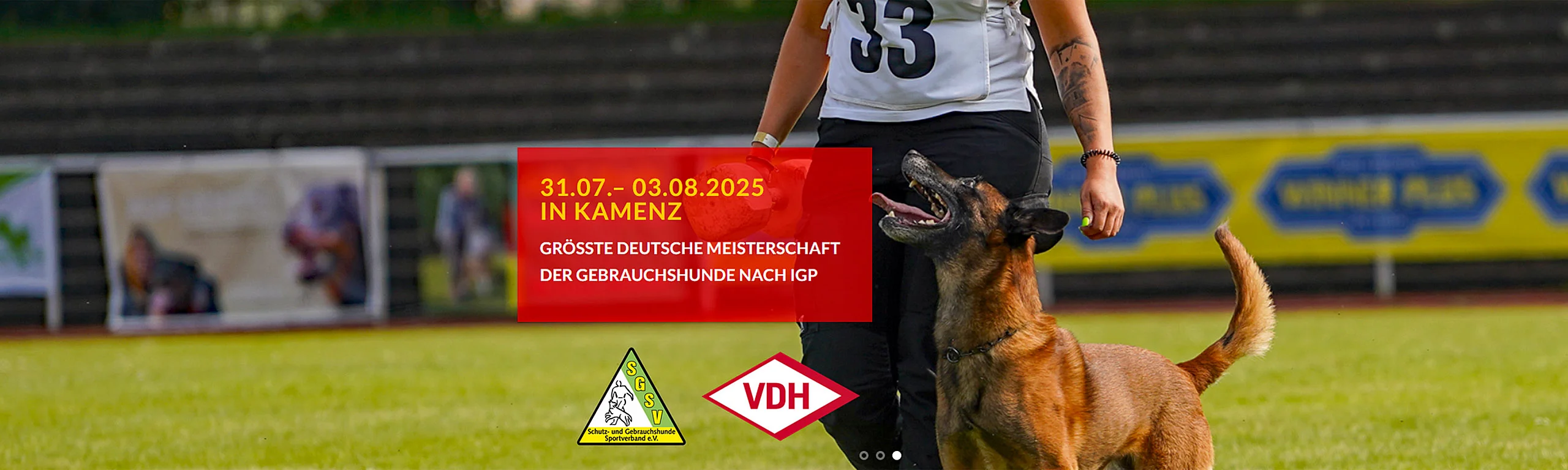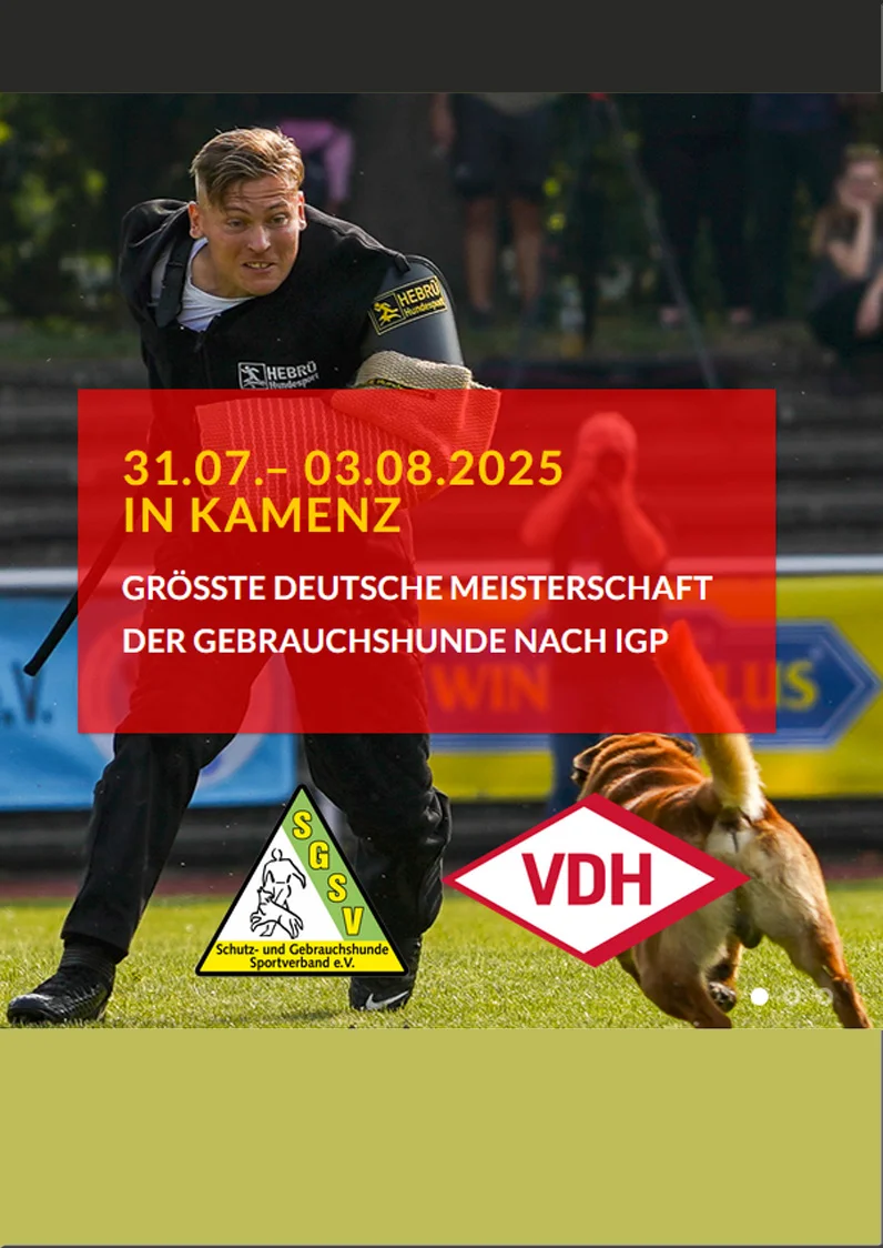 Vom 31.07. – 03.08.2025 findet die größte Deutsche Meisterschaft im FCI-IGP-Sport in Kamenz statt. Aus unserer Landesgruppe ist unser erfolgreiches und leistungsstarkes Team Christine Blees und Varro von der Jagsthöhe wieder dabei. Wir fiebern mit Euch mit und drücken euch alle Daumen!
