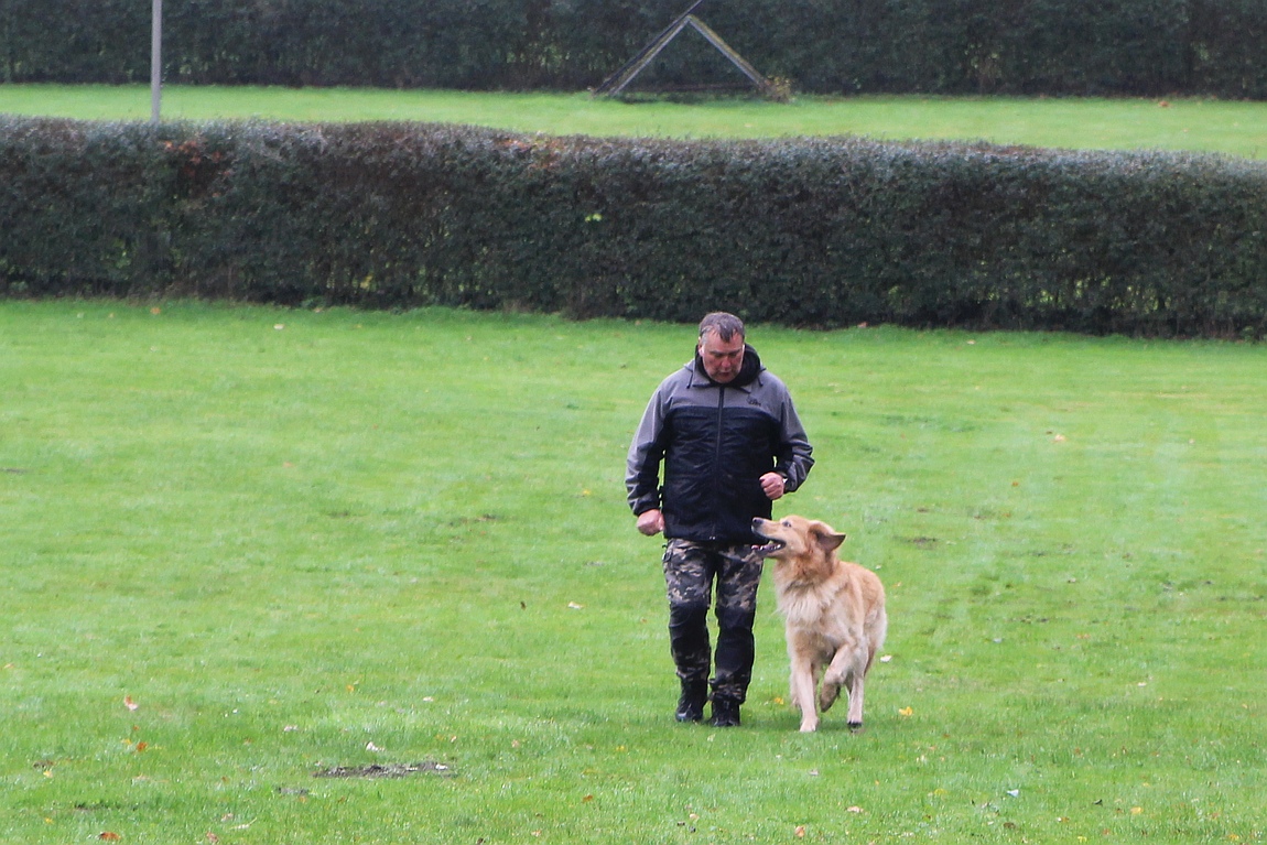 Los ging es um 10 Uhr in der Fährte. Das Gelände war durch den dauerhaften Regen sehr nass und tief. Nach kurzer Begrüßung und anschließender Chip- und Wesenskontrolle startete als Erste Sabine Heinrich mit Yoshi von der Jagsthöhe in der Fährte der IGP-3. Leider erreichte das Team sein Ziel nicht. Im Anschluss starteten die drei anderen Teams und absolvierten die Fährtenarbeit erfolgreich: Thorsten Sprunck mit Eragon vom Königs-Hof, Ralf Modes mit Yellow vom Hause Luka und Walther Grober mit seiner Riesenschnauzerhündin Doris.