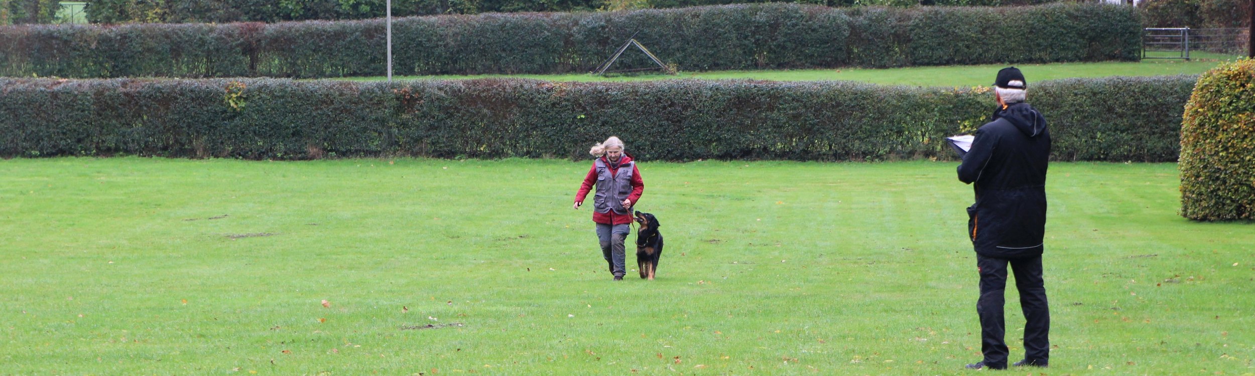 Los ging es um 10 Uhr in der Fährte. Das Gelände war durch den dauerhaften Regen sehr nass und tief. Nach kurzer Begrüßung und anschließender Chip- und Wesenskontrolle startete als Erste Sabine Heinrich mit Yoshi von der Jagsthöhe in der Fährte der IGP-3. Leider erreichte das Team sein Ziel nicht. Im Anschluss starteten die drei anderen Teams und absolvierten die Fährtenarbeit erfolgreich: Thorsten Sprunck mit Eragon vom Königs-Hof, Ralf Modes mit Yellow vom Hause Luka und Walther Grober mit seiner Riesenschnauzerhündin Doris.