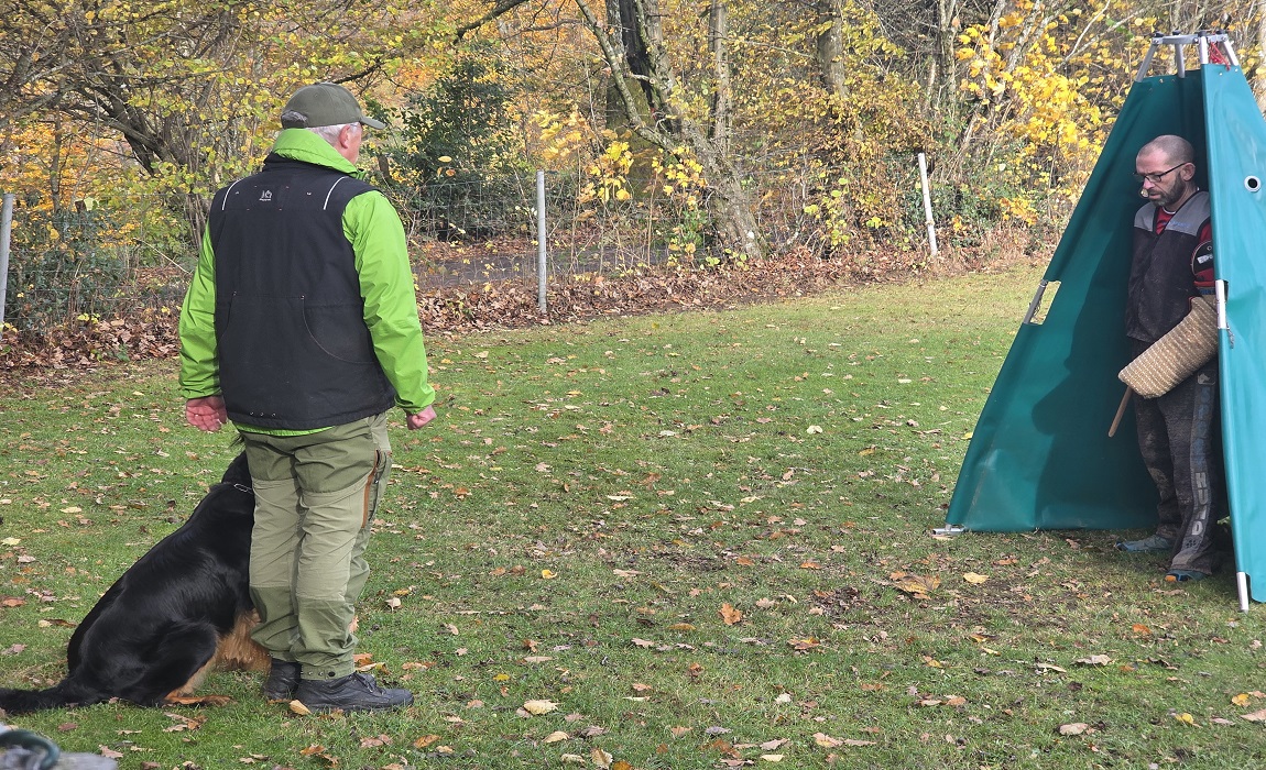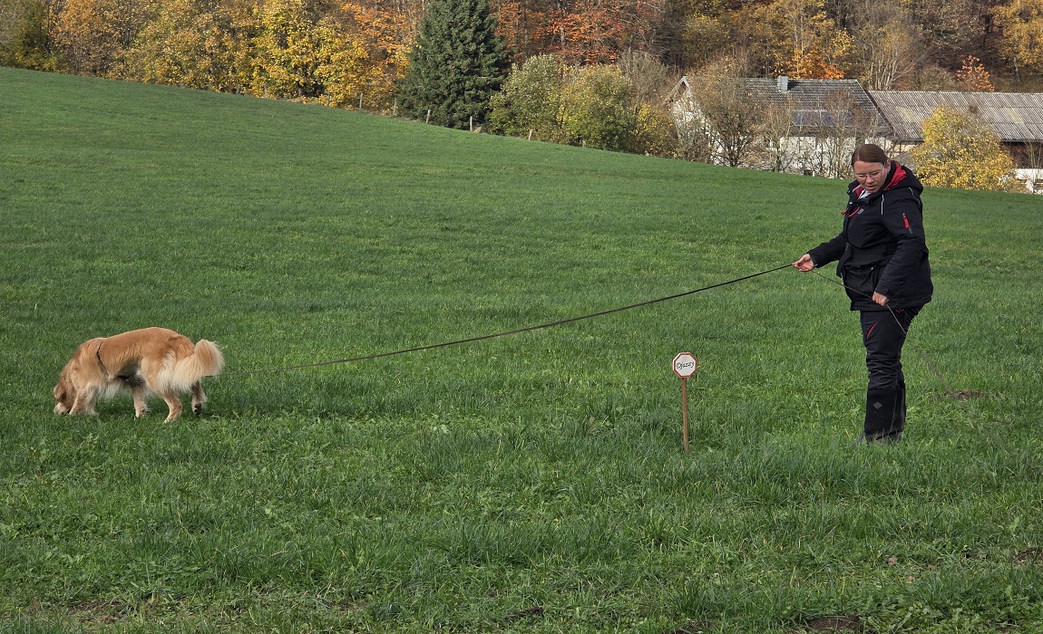 Nun aber endlich zu den Hauptdarstellern: 11 Mensch-Hund Teams waren gekommen, um sich dem versierten Urteil der Körmeisterinnen zu stellen und das Können ihrer Hunde im Parcour zu zeigen. Den Anfang machte der freundliche blonde Rüde Cliff von Oakley Hill, der mit Gelassenheit und gutem Beutespiel überzeugte ein schönes ZTP-Ergebnis erzielen konnte. Higgins vom Pohlsee ließ keinen Zweifel aufkommen, dass man mit Charme, Lebensfreude und guten Nerven die beste ZTP des Tages abliefern kann. Rica von der Hofreite konnten weder große Menschengruppen noch Gespenster aus der Ruhe bringen, was ihr u.a. eine sehr gut bestandene ZTP bescherte. Das hatte sich auch Gino von der Teichlandschaft vorgenommen. Mit schönem Beutespiel und mutigem Verbellen des Pilzesammlers hat auch er die ZTP souverän bestanden. Askan von den Eifelwiesen war für Beutespiel jeglicher Art zu begeistern und hat seine geliebte Beute souverän aus dem dunklen Flaschenparadies befreit. Im Parcours hat seine Teampartnerin Susanne ihm ein wenig den Hovirücken gestärkt und die Beiden haben ein gutes ZTP-Ergebnis erzielt.