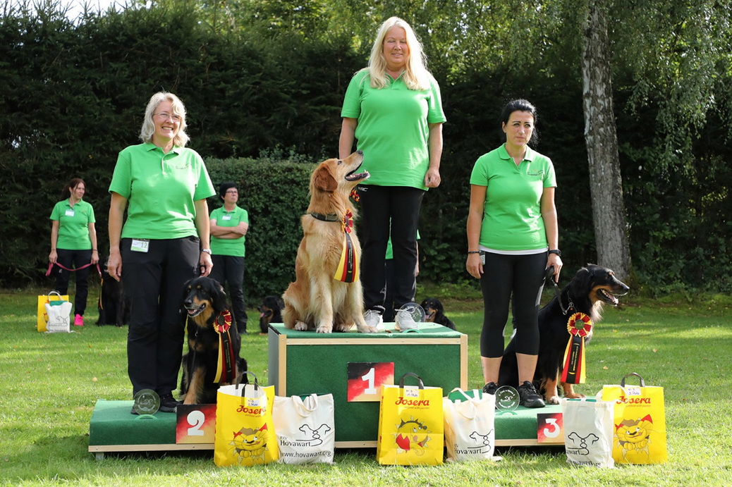 RZV DM Obedience Klasse 3 Siegerehrung – v.l.n.r. Svetlana Gronau, Antonia Müller, Britta Fingerhut