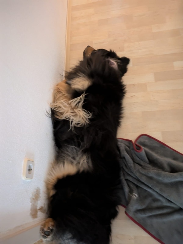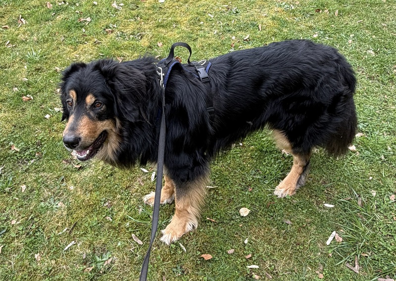 Bei Jogger, Fahrradfahrer und Autos verhält er sich meistens neutral, manchmal würde er aber nachlaufen, deshalb wird er außerhalb des Gartens an der Leine geführt. Jagdtrieb ist vorhanden, daran muss noch gearbeitet werden.