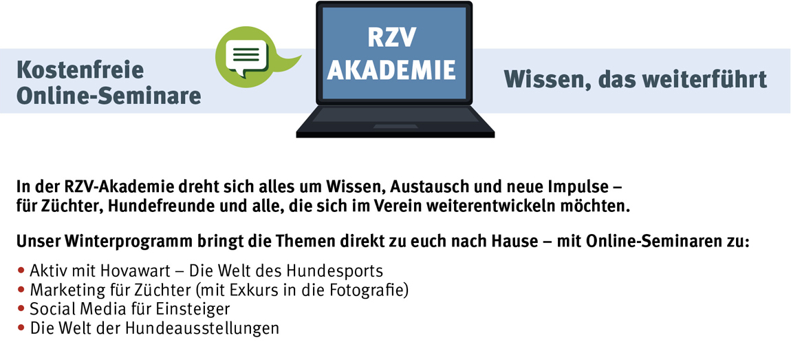 Die vom RZV anerkannten Fortbildungen für Züchter und Zuchtwarte finden Sie in unserer Datenbank im Downloadbereich für RZV Züchter.