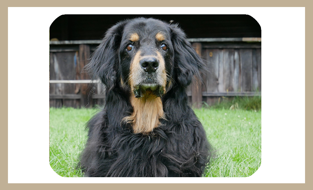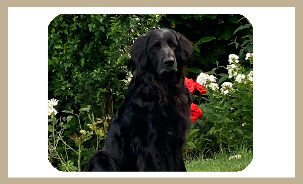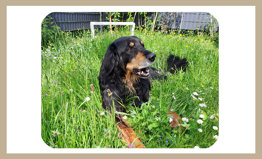Du warst als Junghund ein Graus für unsere Blumen, hast du ihnen doch die Köpfe geklaut wo du nur konntest oder bist auf Hühnereiersuche gegangen. Hühner und Fasane waren deine erklärten Feinde.